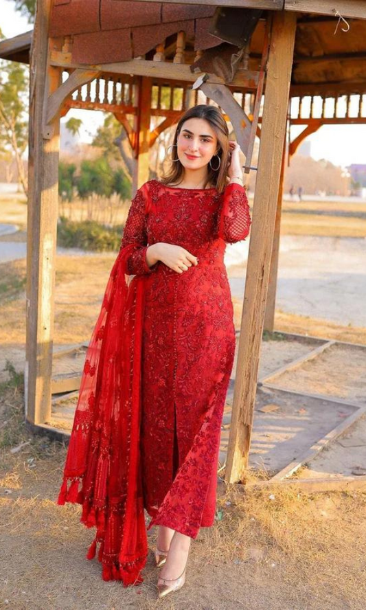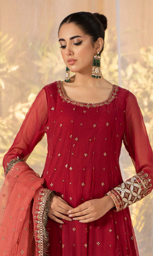 Crimson - 3PC (Unstitched) Dhannak Heavy Embroidered Chikenkari Suit -GSF023